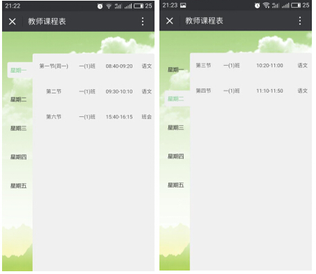 打(dǎ)開教師任(rèn)課表,教師的個人任課信息一目了然;通過查看(kàn)教師任課表,教師可輕(qīng)鬆安排作息時間。