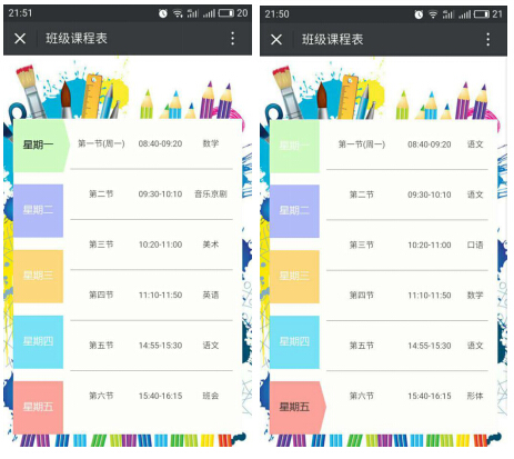 班級課程表形象的展示了班級的課程安排及作息時間(jiān),學生/家長查詢課程表比傳統課表更加方便。