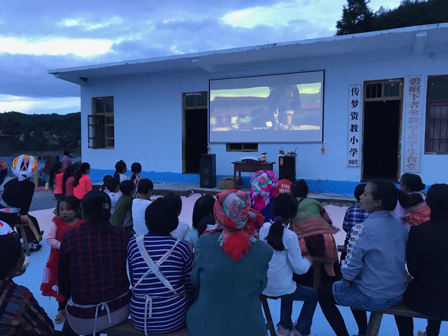 傍晚時分,天色逐(zhú)漸昏暗,但是孩子與村民的熱情還沒有退去。借著音樂會的餘溫,我們(men)為大家組織了一場露天電影,一部《尋夢環遊記》帶著孩(hái)子們的夢想,飛向遠方。