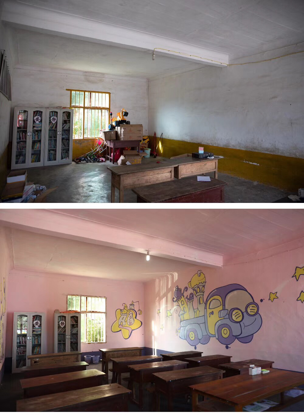 通過拍攝的前後對比照,我們可以很清晰的看到教學點在大家的共同努力下煥然一新,相(xiàng)信小朋友們看(kàn)到(dào),一定會更加喜歡這個地方。