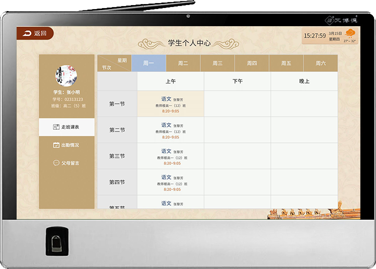 全新的3.0係統,在原有刷卡、指紋考勤基礎上增加多(duō)學生(shēng)人(rén)臉識別係統,便於班級迅速考勤的實(shí)現。新增學生個人(rén)中心功能,學生可以通過班牌與家長進行互動留(liú)言,同時還為學生量身打造了一套全新的走班製選(xuǎn)排課係統,通過智能優化課程、自動(dòng)統計課程數據來實現更高(gāo)效的排選課(kè)。