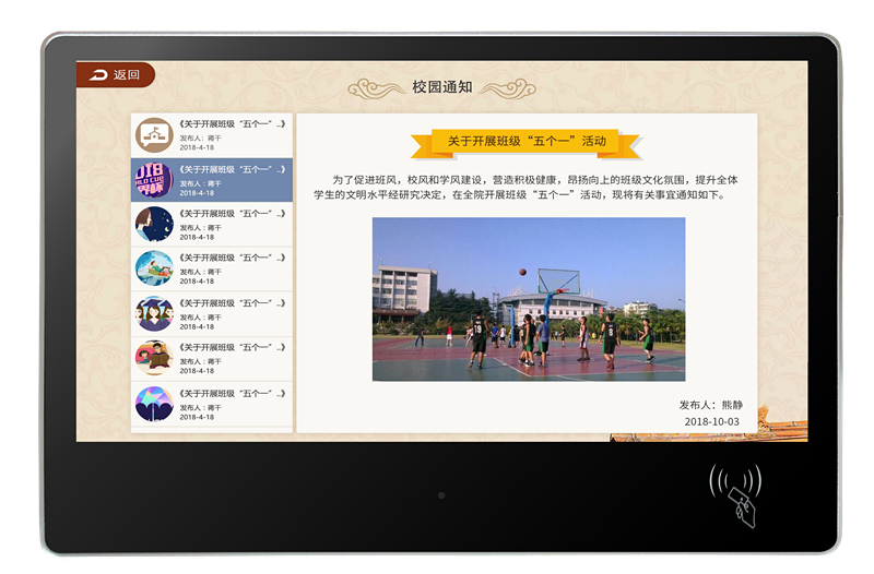 蜜桃my.1688.com视频智慧雲班牌集文化展示、信(xìn)息發布、考勤管理、智能門禁(jìn)等功能(néng)於一體,打通學校和教師、教師和學生,學生與家長,學校和家長之間的互動通道,真正的將智慧校園落地。