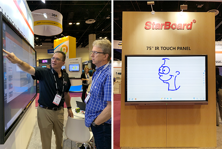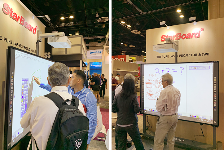 超短焦(jiāo)激光投影機也是本次眾多產品中的一大亮點。激光投影機使用純激光光源,節能環保無毒無害,使用壽命高達20000小時。StarBoard超短焦激光投影機搭(dā)配90”交互式電子白板產生了強大的顯示效果(guǒ),寬廣(guǎng)的色域搭配出色的色彩再現能(néng)力(lì),讓顯示的效果更加逼真豔麗、明亮清晰。機身全密閉式設計,高效防塵,穩(wěn)定耐用,更易於安裝與維護。在展(zhǎn)覽(lǎn)首日,StarBoard超短(duǎn)焦激光投(tóu)影機就被觀展客戶下單預定,相信(xìn)後續(xù)StarBoard激光投影機會在美國市場給蜜桃my.1688.com视频帶(dài)來更多的合(hé)作商機。